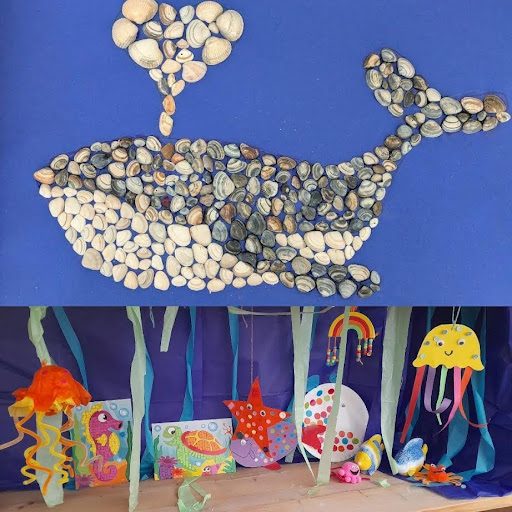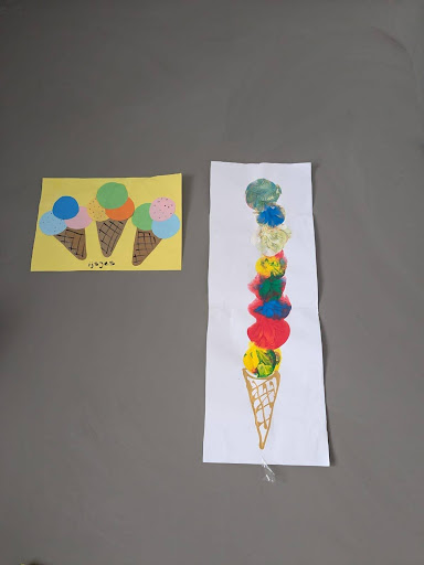 We namen schelpen mee van het strand en zochten de grote, kleine, donkere en lichte schelpen uit. Daar maakten we een walvis en een fotolijstje van. Ook telden we schelpen en ijsbolletjes. Dat zorgde voor allemaal vrolijke knutsels!